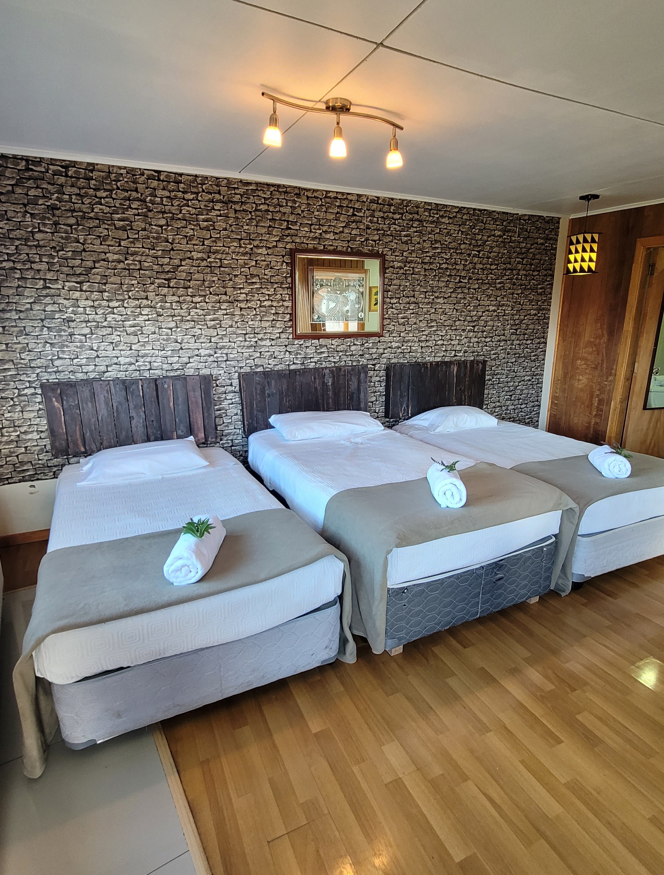 - 4 Tipo Bungalow para cinco personas, estás cuentan con una habitación con cama Queen size (2 plazas), sala de estar de concepto abierto, donde se ubican las tres camas Twin size ( 1 1/2 plaza) cada una.